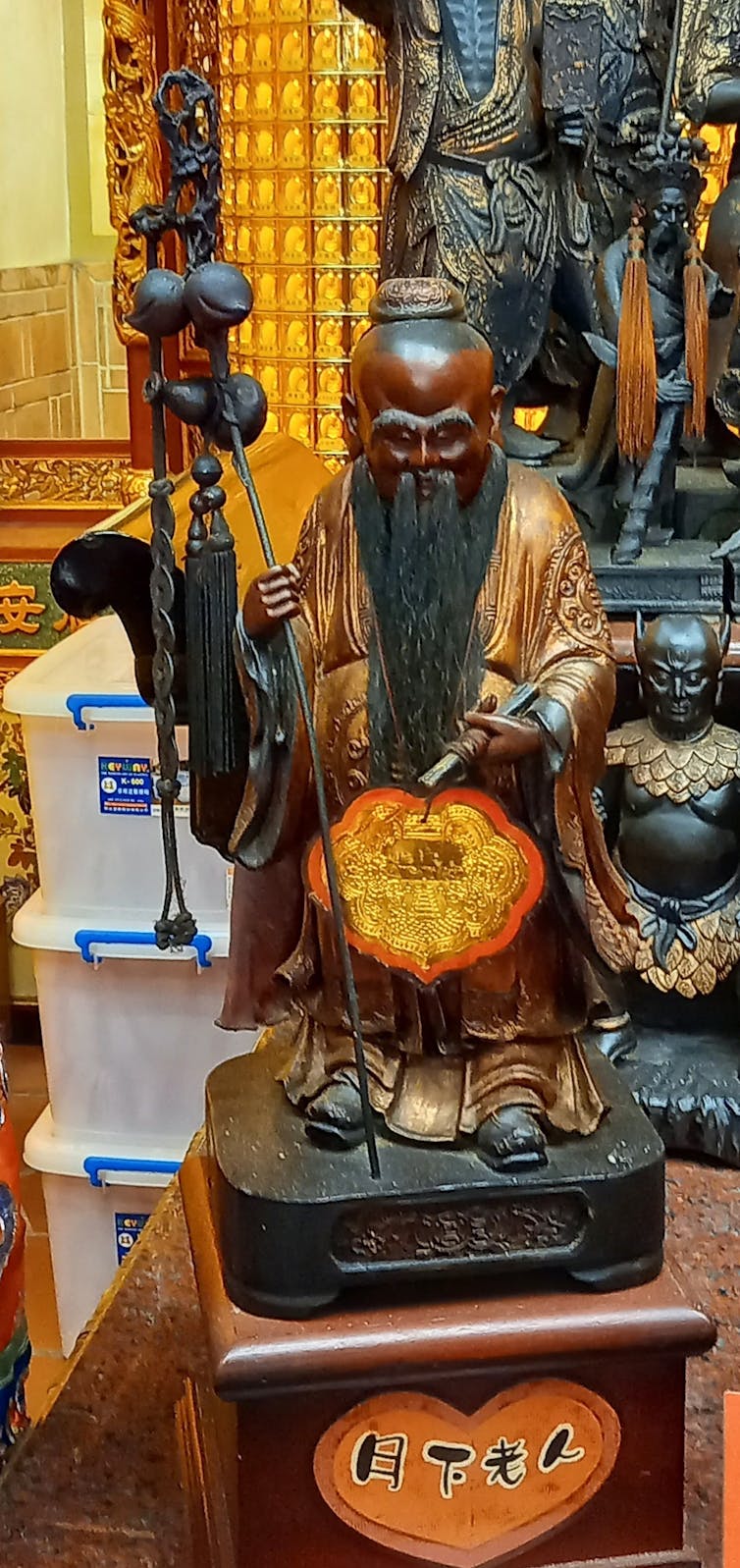 Прикладно, изгледа као старац са дугом белом брадом и држи црвене конопце које везују парове једно за друго. Људи који желе да пронађу партнера често остављају црвене конце везане за гране дрвећа, понекад са кратким молитвеним текстовима причвршћеним за жице, изван светилишта Старцу под месецом.