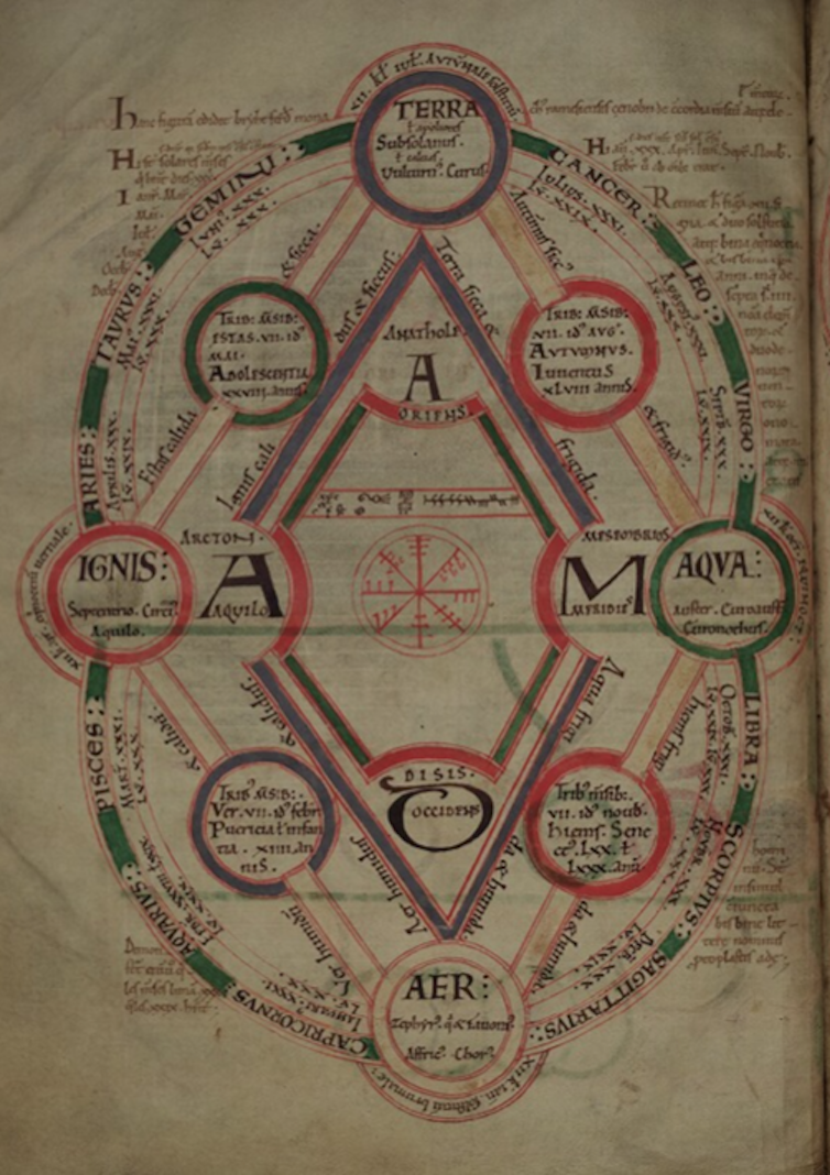 Биртхтферт је био познат по разрађеним дијаграмима, а овај (горе) је његов најпознатији. Овај дијаграм приказује космичку кореспонденцију између годишњих доба (представљених у спољашњем кругу астролошким знацима) са равнодневицама и солстицијама постављеним на угловима.